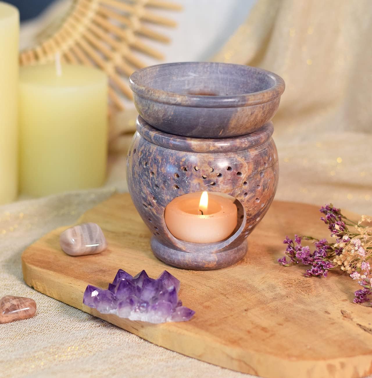 2-in-1 Soapstone incense burner to practice magical rituals or create a specific atmosphere. 2 in 1 use: - With the charcoal grate for burning incense in dried grains, resin, cone or plant. - With the cup and its location for tea lights for the diffusion of essential or fragrant oils.
