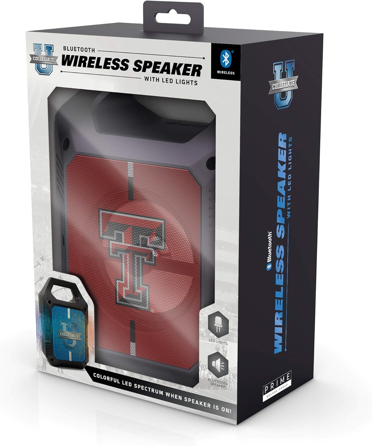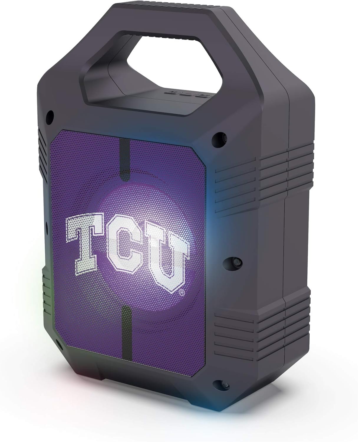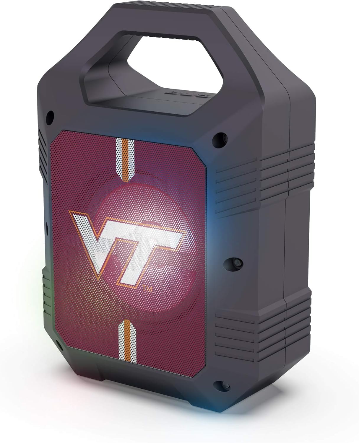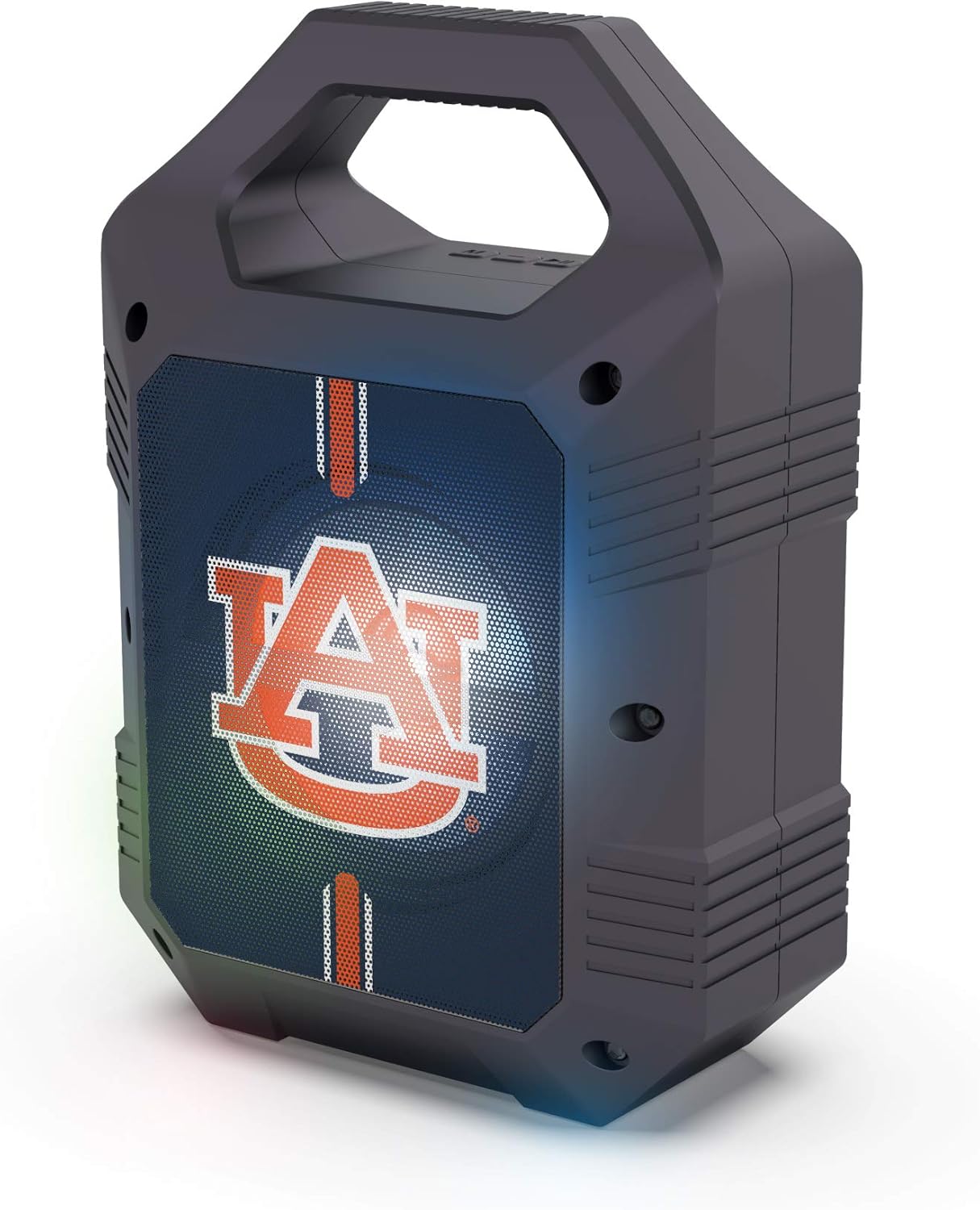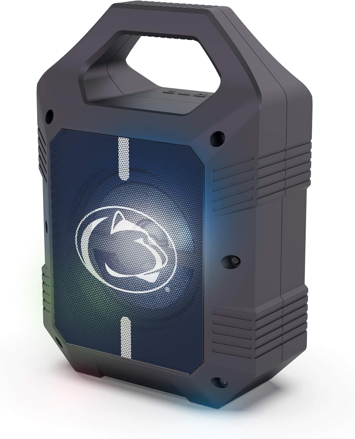 The SOAR XL LED Speaker is the perfect speaker for your next tailgate or camping trip. Light weight with a convenient top handle for easy portability and storage. Bluetooth 5.0 technology, AM/FM radio, USB, and Aux inputs, play your music your way. Easily sync two together for stereo sound. Over 5 hours of use time per charge, micro-USB cable included. Officially Licensed NCAA Product, a great way to show your team spirit any time and anywhere.