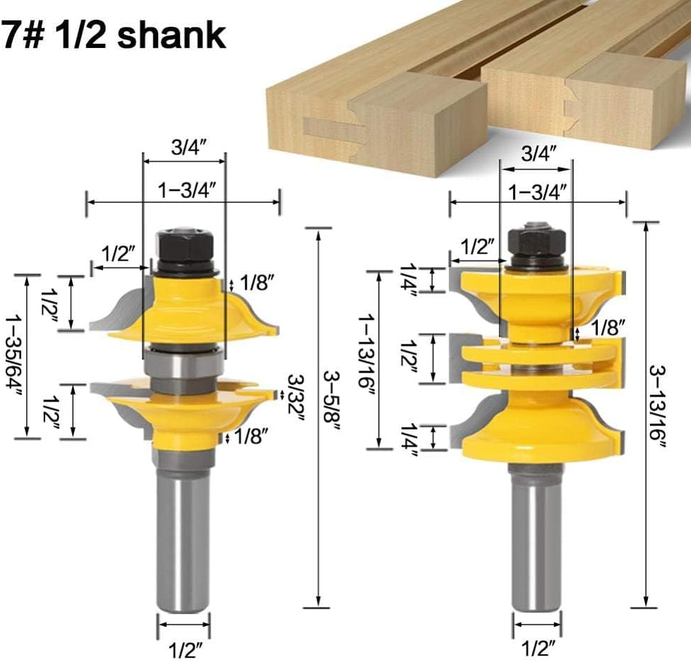 2 Bit Rail and Stile Router Bit Set Material: 45# steelCarbide tip: YG8Color: as picture shownThis rail and stile router bit set is designed for high-precision woodworking, including rail and stile, shaker-style bits, and a carbide door knife. Ideal for creating professional-grade tenons and rails, this set offers durability and sharpness for clean cuts. Each bit is crafted from carbide, ensuring long-lasting performance and reliable results. Perfect for woodworkers aiming to achieve high-quality door frames and furniture pieces, this set is a must-have addition to any woodworking toolkit.