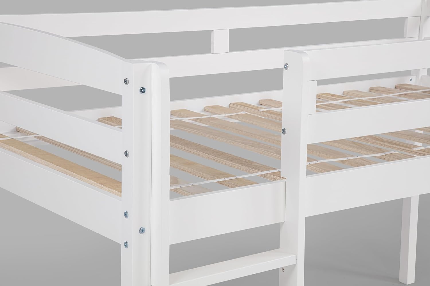 The Concord Low Loft Bed is an intelligent solution for limited spaces. It frees the floor, making room for play, extra storage, or even placement of a second mattress on the floor beneath it. This low loft bed is the perfect compromise for younger kids who may not be ready for a high loft or bunk bed. Constructed of 100% solid wood, this loft bed features front and rear safety guard rails. The attached ladder can be placed on either the left or right side of the bed. The bed includes a 14 piece slat foundation - no box spring is needed. With safety in mind, this bed passes all government safety standards and is ASTM certified. The Concord's understated sleek design projects an open and airy look to your space. The bed features an easy to clean, child safe, protective finish. This bed will brighten up any room with its cool white finish.