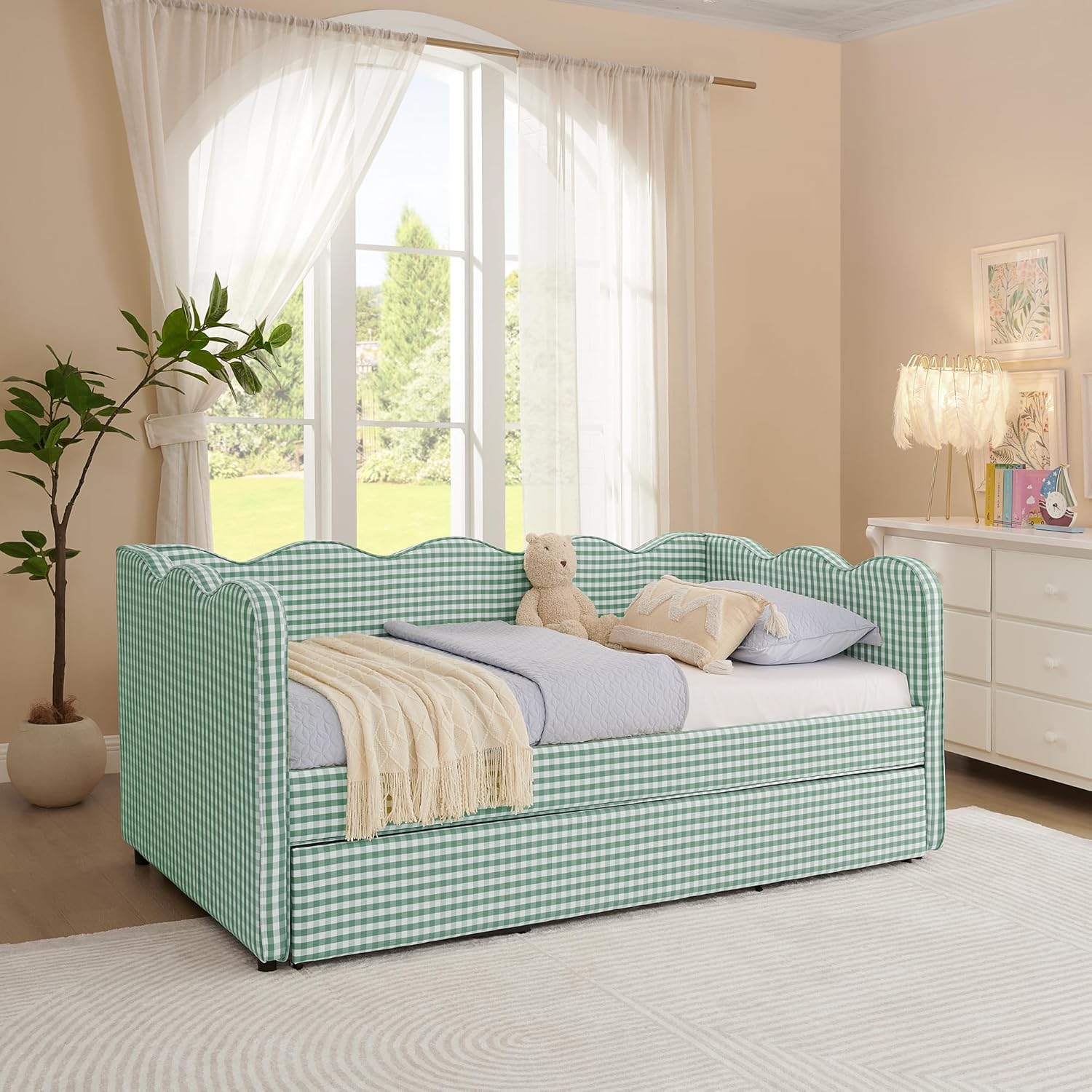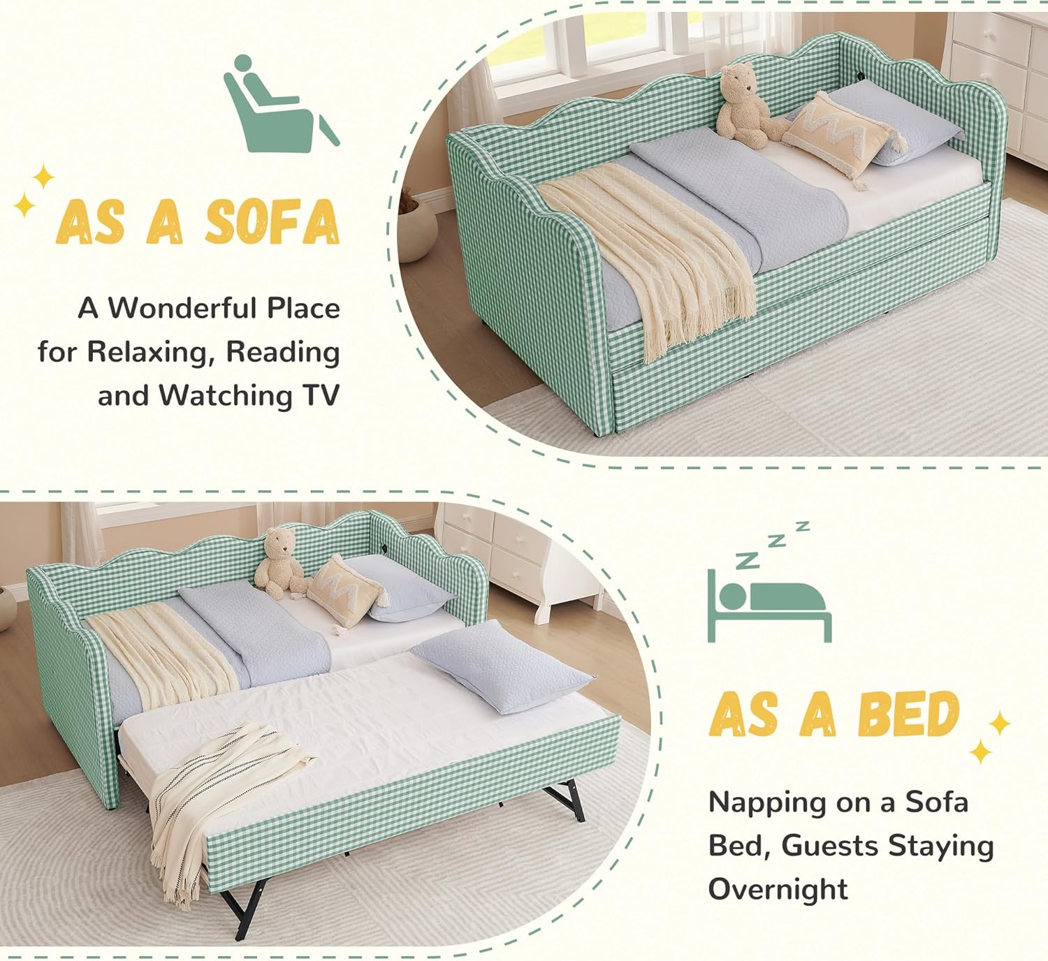 • 【Multifunctional Design】This versatile daybed with pop-up trundle effortlessly transitions between sofa and bed. Ideal for extra daytime seating or transforming into a comfortable guest bed, it adapts to diverse needs—making it a perfect space-saving solution for living rooms, bedrooms, and guest rooms.