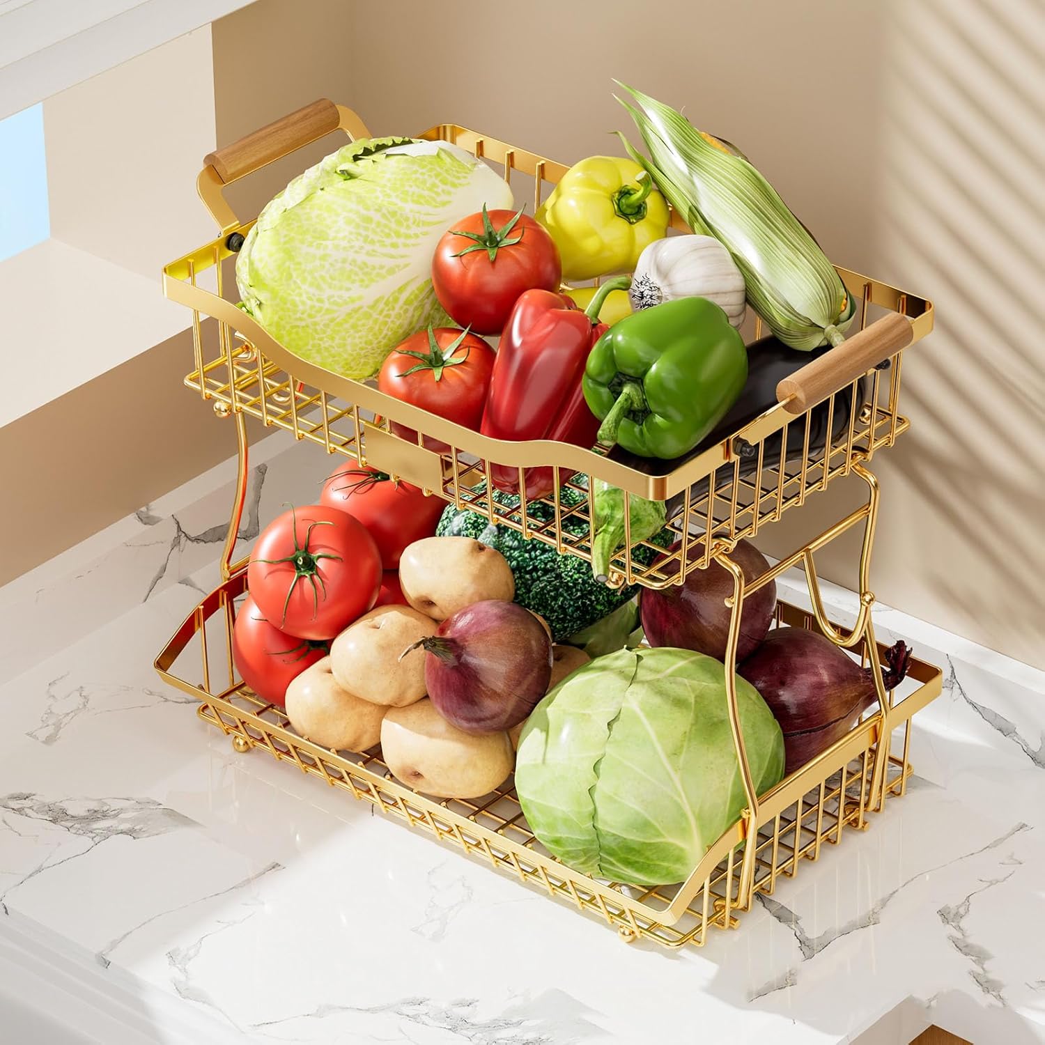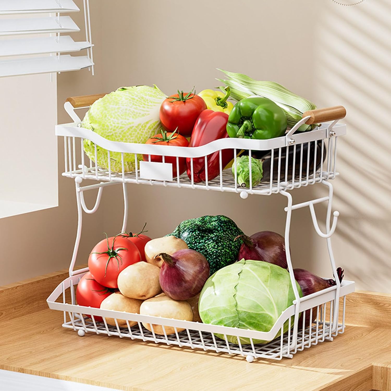 Two Tiers Iron Organizers Shelf for Kitchen Countertop Bathroom Easy Wipe Surfaces Seamlessly Home Decoration Features: Maximizes kitchen and bathroom storage with our double tiers iron fruit vegetable organizers, featuring rustproof coating for long time durability in humid environments Crafted from sturdy iron with base, this space saving shelf storage for fruits, vegetables, and bathroom accessory while resisting Ideal for homeowners and renters seeking tidying space, this versatile organizers caters to those prioritizing efficient storage without compromising on styles organize produce in kitchens or toiletries in bathrooms using its wipe surfaces and vertical designs that adapts to living areas Combining industrial strength construction with minimalists aesthetics, this rustproof shelf elevates home functionality while blending seamlessly into modern decoration schemes Specifications: Materials: Iron Color: Black / White Size: 32x24x41cm / 12.6x9.45x16.14inch Package Includes: 1pc Vegetable Storage Rack Note: 1.Please allow 1-2cm errors due to manual measurement, making sure that you will not mind before order 2.Due to the differences between different monitors, the picture may not reflect the actual color