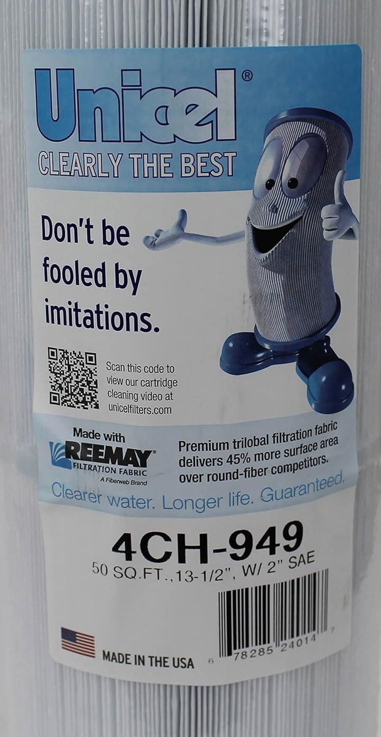 Featuring 50 square feet of 3-ounce basis weight media made of 100-percent polyester Reemay material, this Unicel 4CH-949 Cartridge Filter for Hot Tubs ensures high performance and dependable filtration over time. The uniform pleats and Reemay media deliver higher dirt-holding capacity and more time between cleanings. Plus, the smooth surface of the media makes it easy to maintain, resists degradation from chemicals, stands strong under pressure, and holds up to the rigors of multiple cleanings. For optimal lifespan, clean the elements as per instructions and use a soft brush cleaning tool or filter cleaner for easy maintenance. Please note that the cartridge life depends on routine maintenance and spa water chemistry. Change your filter when there is a shorter cycle between cleaning, low water flow rate or high differential pressure, when the media has a tear, or if the center core collapses. The end cap is made of durable plastic that resists damage from chemicals and includes a 2-inch female SAE thread and a v-groove semi-circular handle for easy removal and replacement. This 4CH-949 model of spa filters is compatible with Advanced Spa Design and Blue Ridge Spas. The Unicel 4CH-949 Spa Cartridge Filter is clearly the optimal choice to keep your hot tub or spa water sparkling.