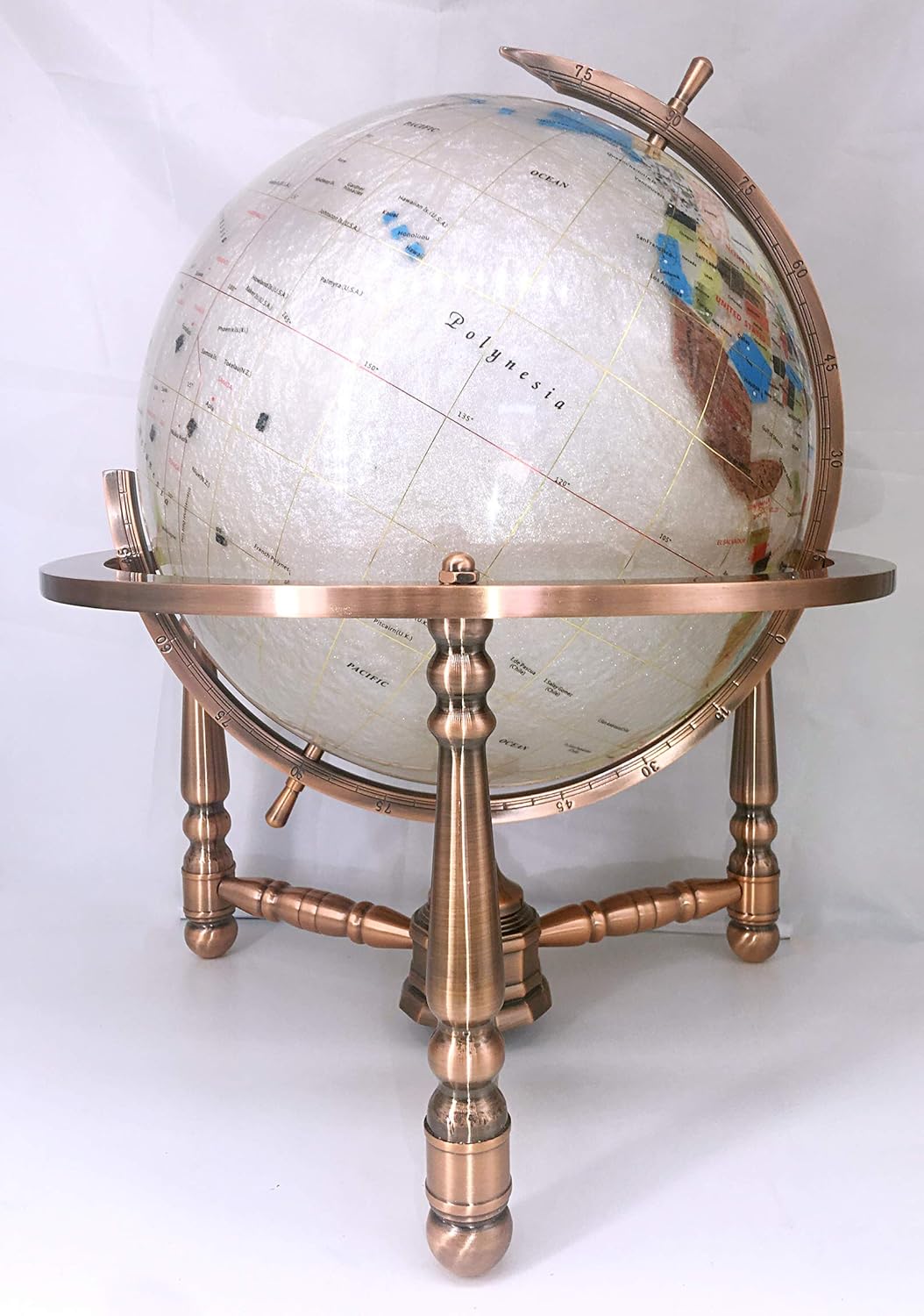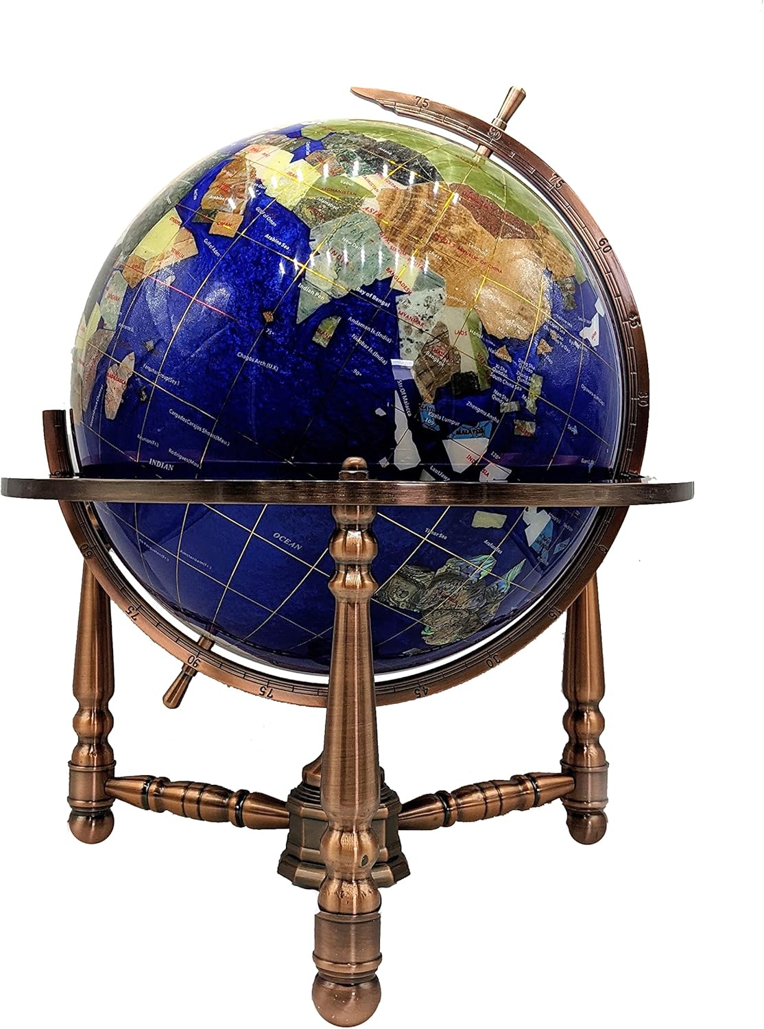 This unique pearl swirl ocean gemstone globe is brand new and in perfect condition. It is painstakingly handcrafted by the most talented artists by, using more than 30 different semi-precious gemstones from all over the world. This globe have used large amount of fresh water pearls that pulverized, Crashed to powders, and mixed with an epoxy and poured to make the ocean part of the globe (it is a very complicated and expensive procedure, precise control of temperature is the most essential factor in the processing cycle). This is a huge amount of striking and dramatic hand-crafted stone work. This globe is built with the beautiful ornate, tripod leg copper coated heavy zinic alloy stand into which the globe has been carefully mounted. At the bottom of the stand, a precise glass-topped integral brass compass is incorporated to complement the globe. Each country is inlaid from a different stone, and the stones are individually cut and ground to exacting interlocking shapes, polished and set into this exquisite piece of art with care and attention to adjacencies. The elements of the globe are created out of lapis lazuli, mother of pearl, amethyst, african jade, tiger's eye, jasper, turquoise, purple quartz, onyx, unakite, abalone, green marble and many other beautifully hued and richly veined stones. The latitude and longitude lines are very thin ribbons of polished brass, embedded through the globe. Each globe requires ten individual steps to compose and it takes more than 2000 hours of labor to complete.