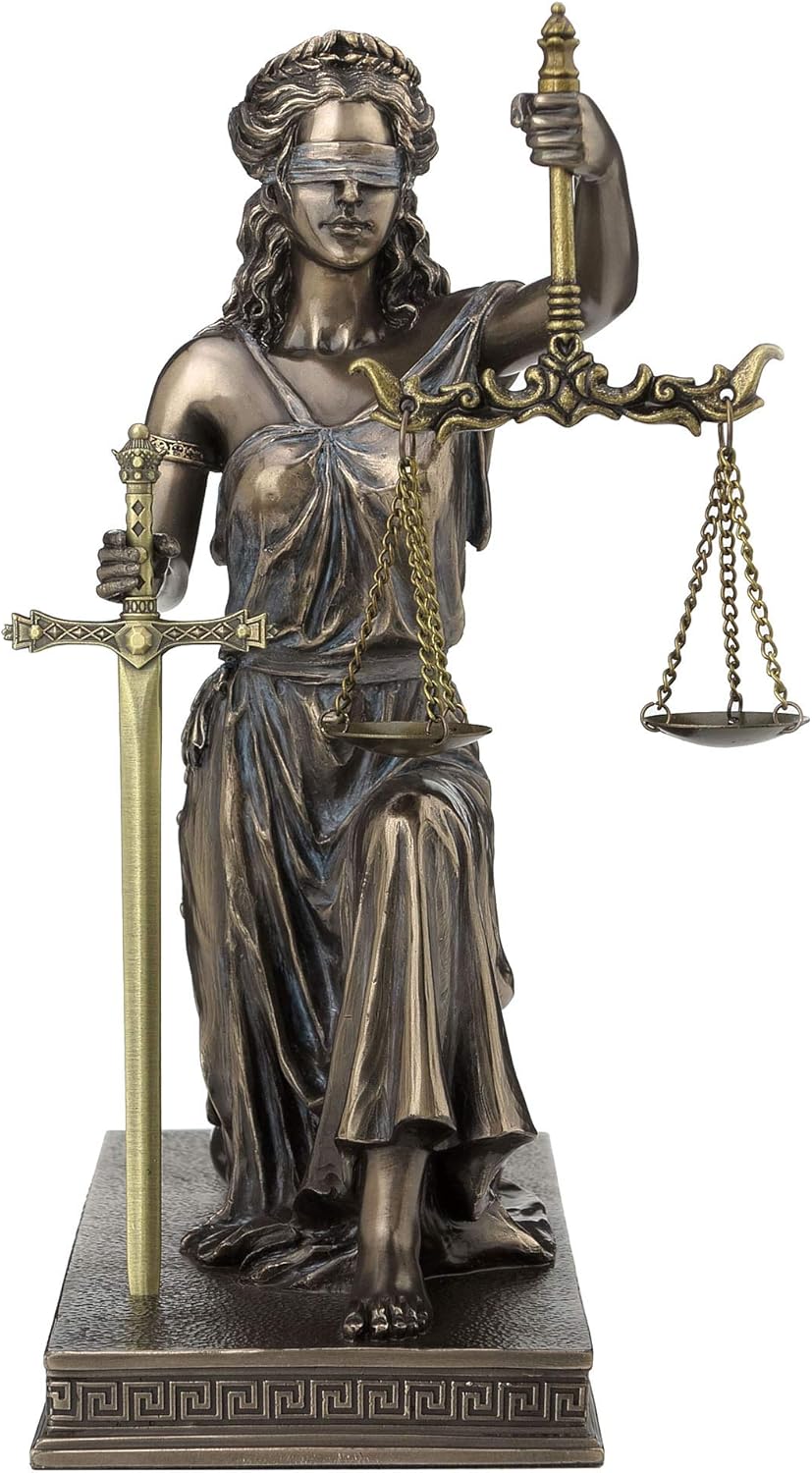 Justitia was the Roman goddess of Justice. Her origin may be from the Greek Titan Themis, who was an oracle at Delphi, and became known as a goddess of divine justice. Her daughters Dike and Astraea were also known as goddesses of justice, but not "divine justice." There are many variations of the way Justitia is depicted, but most often she is portrayed as carrying the scales of justice in one hand and a sword in the other and with her eyes blindfolded which symbolizes the fair and equal administration of the law without corruption, avarice, prejudice, or favor in the legal systems throughout the western world.