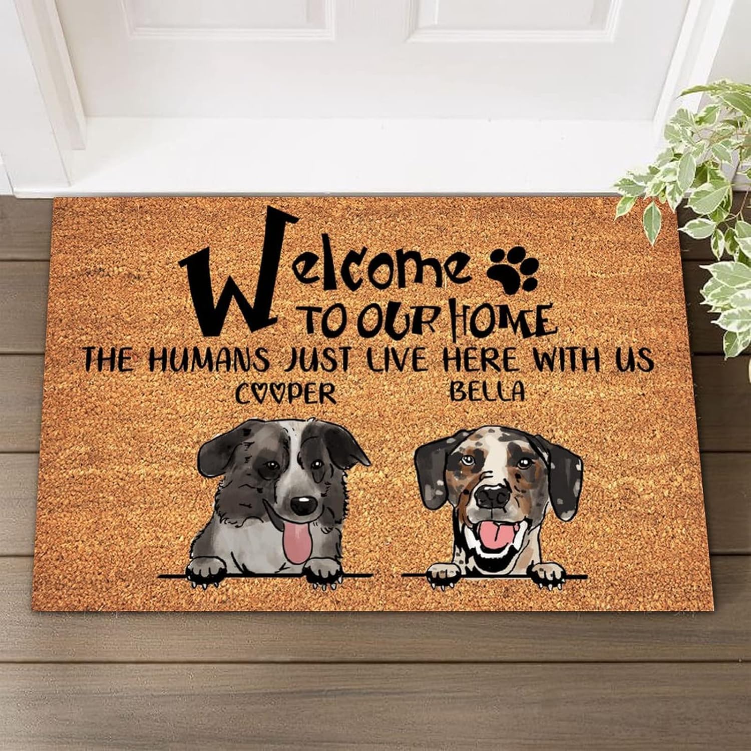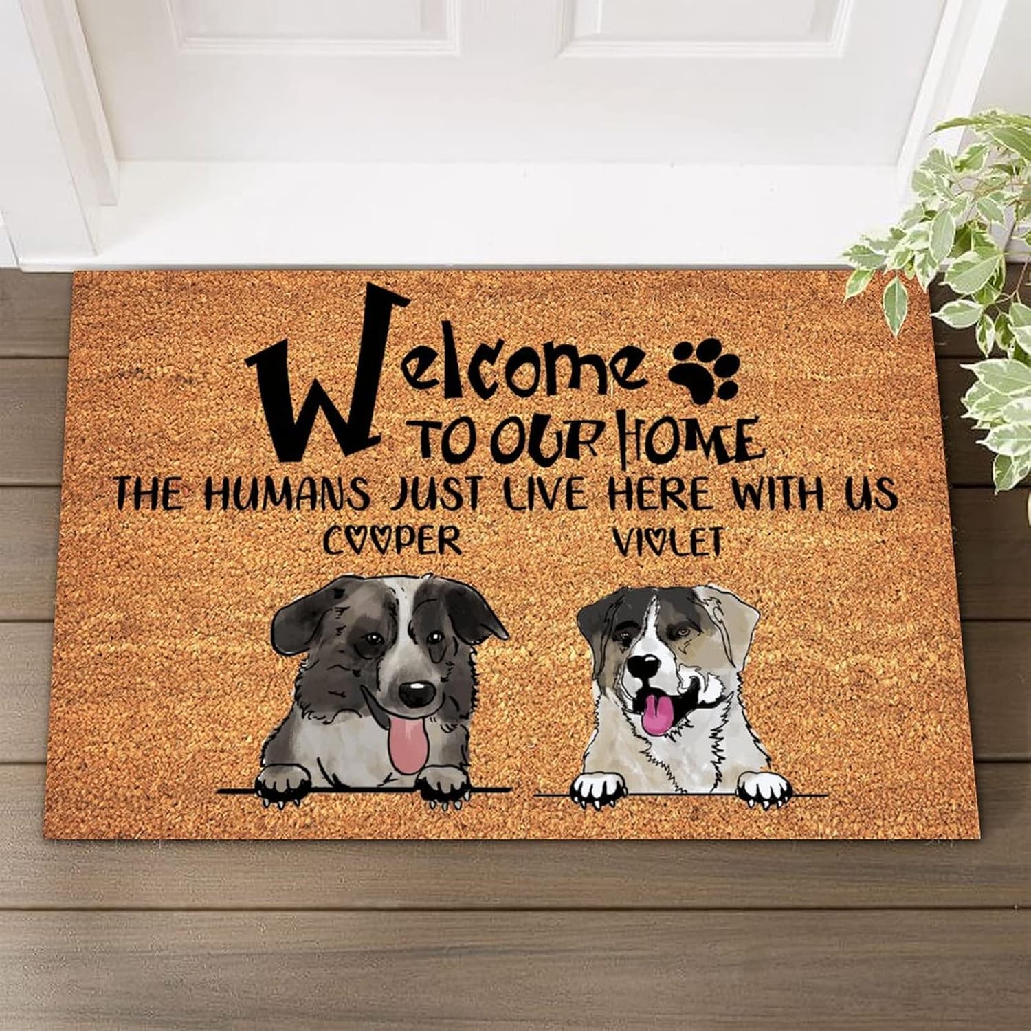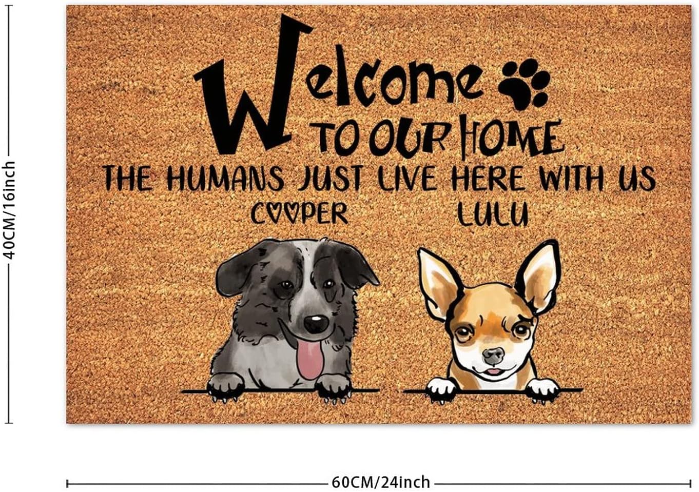 FeaturesWelcome to Our Home,The Humans Just Live Here with Us Coir Mat Custom Pet's Name Personalized Decorative Mat Natural Fade - Vinyl Backed Dog Cat Pet Lovers Gift Natural Outdoor Welcome Coir Door Mat 16x24in Functions and advantages of the door mat1, Beautiful Exquisite Embroidery Craftsmanship DoormatThe outdoor mat is a great gift for your home decoration.It will leave a lasting first impression and will help to welcome your guests and visitors in style.Your visitors will love the warm greeting they receive when they come for a visit.These functional and attractive mats have eye-catching designs that are a charming and welcoming addition to your home funny decor.2, keep your house cleanWaterproof Doormat comes with strong weaving pattern. Waterproof Polypropylene floor mat. pet friendly.This rug is ideal for scraping dirt and mud of the shoes .4, High quality Floor MatThe outdoor entryway mats are made of all-natural and sustainable vinyl fiber and backed with non-slip rubber backing for durability and safety.The wide variety of unique designs are hand finished using permanent dyes for long-lasting style.Our heavy-duty doormats are ideal for high-traffic areas, including front entryways.Warm tips(1), There may be slight differences in color due to lighting, camera, etc. during shooting. the color is subject to the actual object.(2), Manual measurement will have an error of 0.1-0.3 inch