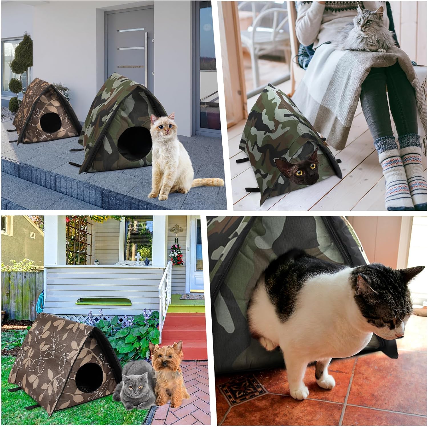 Features: The package of 4 outdoor cat houses makes it an ideal gift option for a friend or family member who is a cat lover. Each house is beautifully designed and provides comfort for the pets, making it a thoughtful present for diverse occasions. Meticulously crafted, our pet tent illustrates our commitment to maintaining quality. The material, design, and unique attributes all add up to a product that underscores our promise of providing a safe and cozy shelter for your pets. Rest, play, or escape, these cat houses cater to all feline needs. Specifications: Material: PVC coated waterproof oxford cloth Color: as pictures shown Size: about 12.8 x 15.3 x 12.6 inches/ 32.5 x 39 x 32 cm Package includes: 4 x Cat houses with tent stakes Notes: Manual measurement, please allow slight errors on size. The color may exist a slight difference due to different screen displays Please pay attention to the size of your cat before purchasing to ensure that your cat can use it normally.