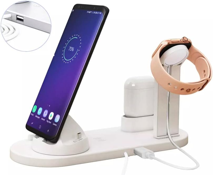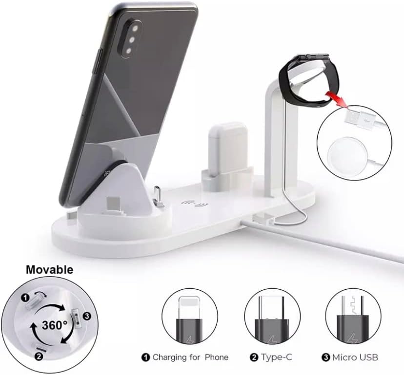 • 6 in 1 Wireless Charging station for Apple iPhone and for AirPod earbuds. The multifunctional charging stand with iPhone/Micro/Type-C interfaces can charge almost all mobile devices. Also the charging dock can be freely rotated by 360 degrees.