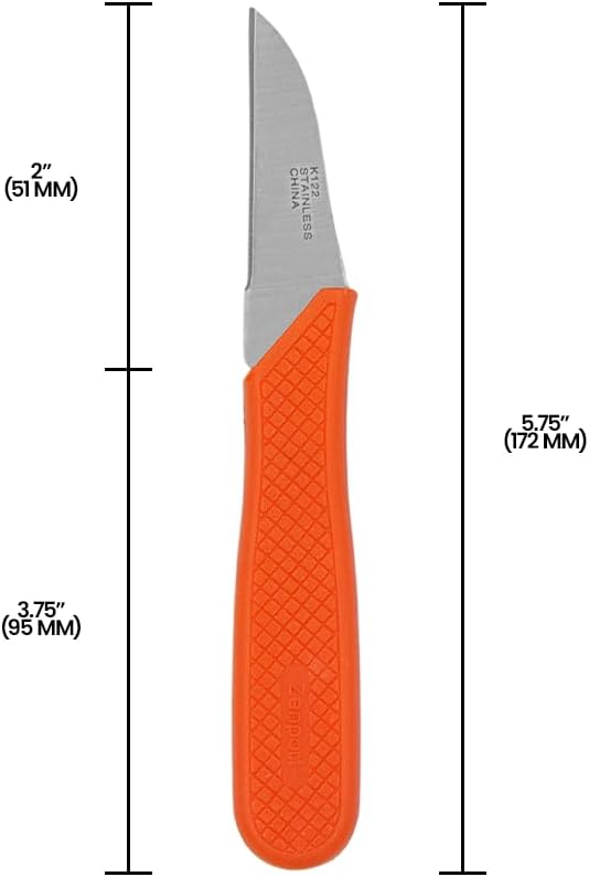 Zenport K122 food processing knife with a 2-Inch smooth stainless steel blade and textured non-slip molded plastic handle is used primarily in food processing applications and in preparing fruits and vegetables. Box of 24 knives.