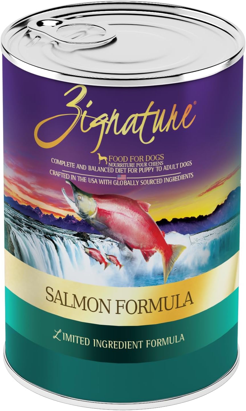 Zignature Canned Salmon Formula features high-quality salmon as the main ingredient, and provides at least 78% moisture to support daily hydration. Salmon is a lean protein rich in Omega-3s, which support the immune system and aid in reducing inflammation. Salmon may be an excellent option for dogs looking to maintain healthy skin and coat!